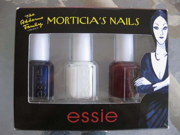 Today's nails are special, some of the colors that I used to create them were created by Bebe Neuwirth with Essie polish company for charity! They're part of a limited edition set called 'Morticia's Nails'. The set contains 3 polishes, Blood Curdling Red (dark red), Bone Chilling White (white), and Midnight Tango (deep metallic navy). The cool part is that 100% of the sale goes to charity... The Actor's Fund to be exact. The Actor's Fund is an organization that provides health and social services to any and all people in the entertainment industry (actors, screenwriters, stagehands, makeup artists, etc.) that are in need. This is a cool polish set with a good cause, and a must for Addams Family fans!!